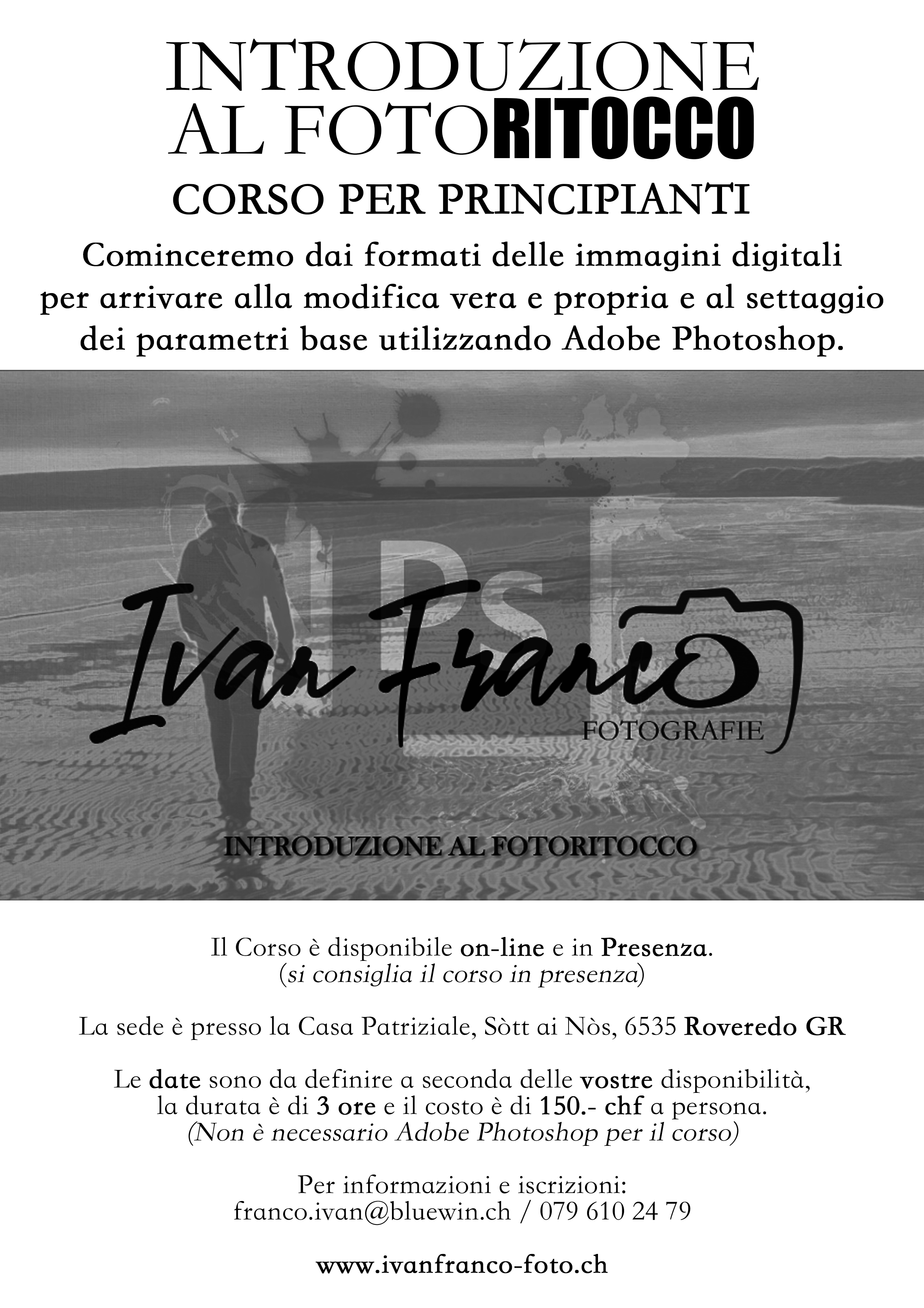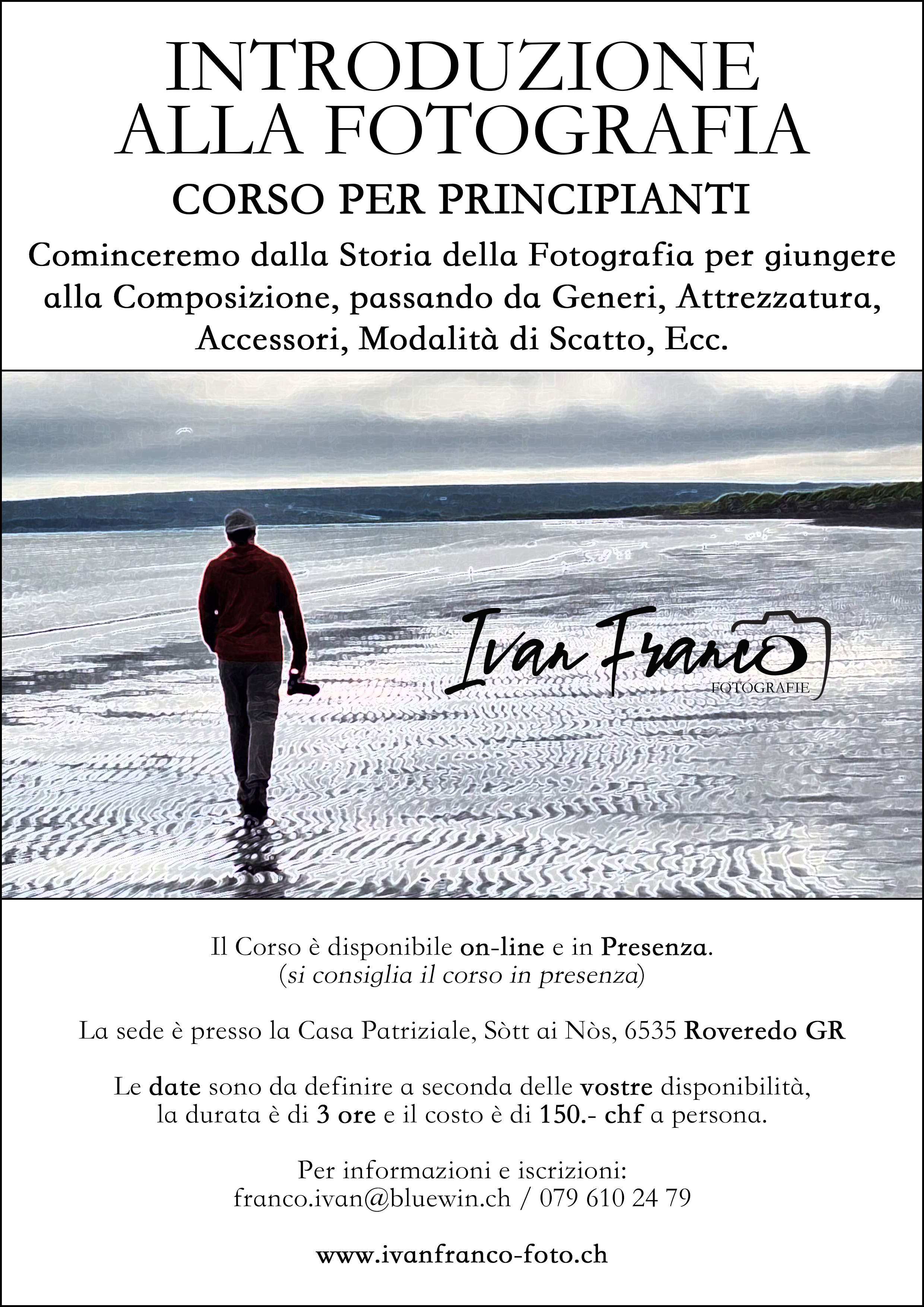 IL COSTO DEI CORSI È DI CHF 150.- A TESTA (MASSIMO 2 PERSONE SE NON CI SONO RICHIESTE PARTICOLARI) E LA DURATA DEI CORSI GENERALMENTE è DI CIRCA 3 ORE. A RICHIESTA SI POSSONO ESEGUIRE WORKSHOP IN ESTERNA, NOTTURNE, ECC...